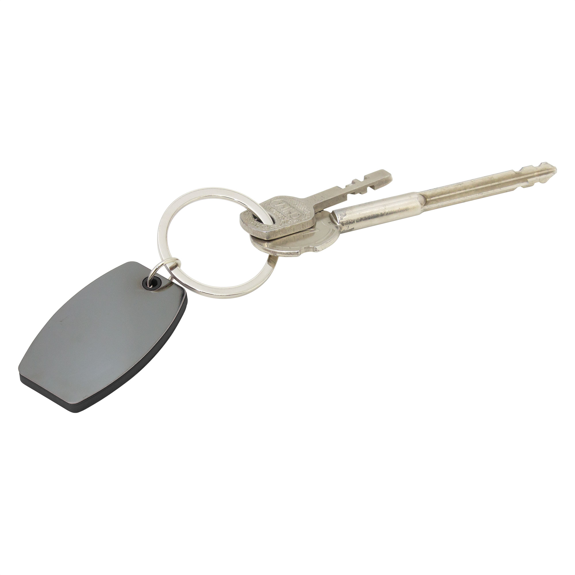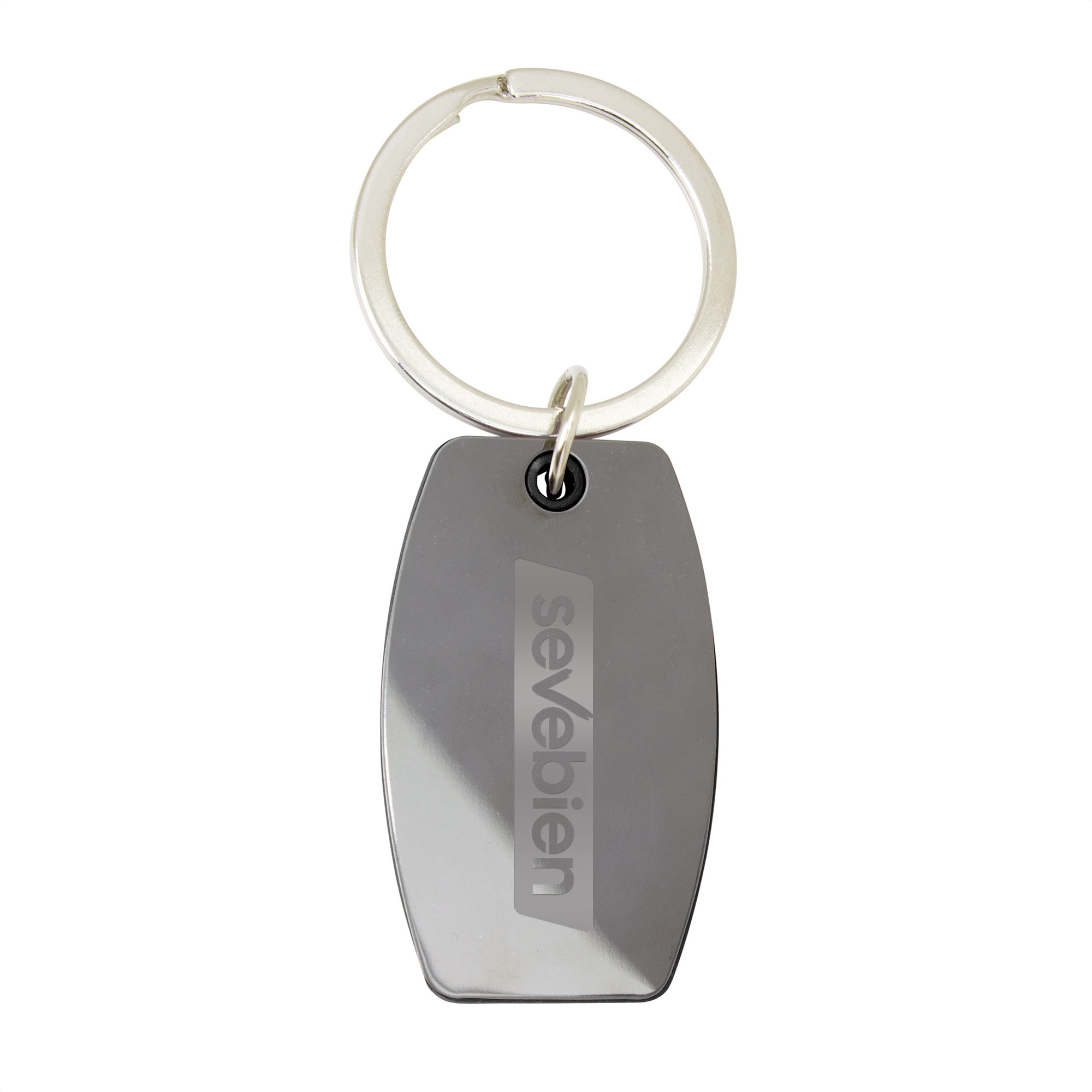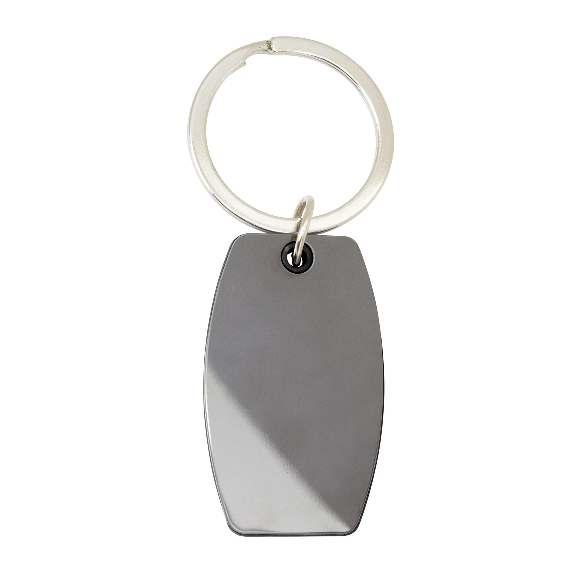 Llavero con forma ovalada. Estructura plástica de color con apliques de acero color gris gun de cada lado. Acabado brillante.