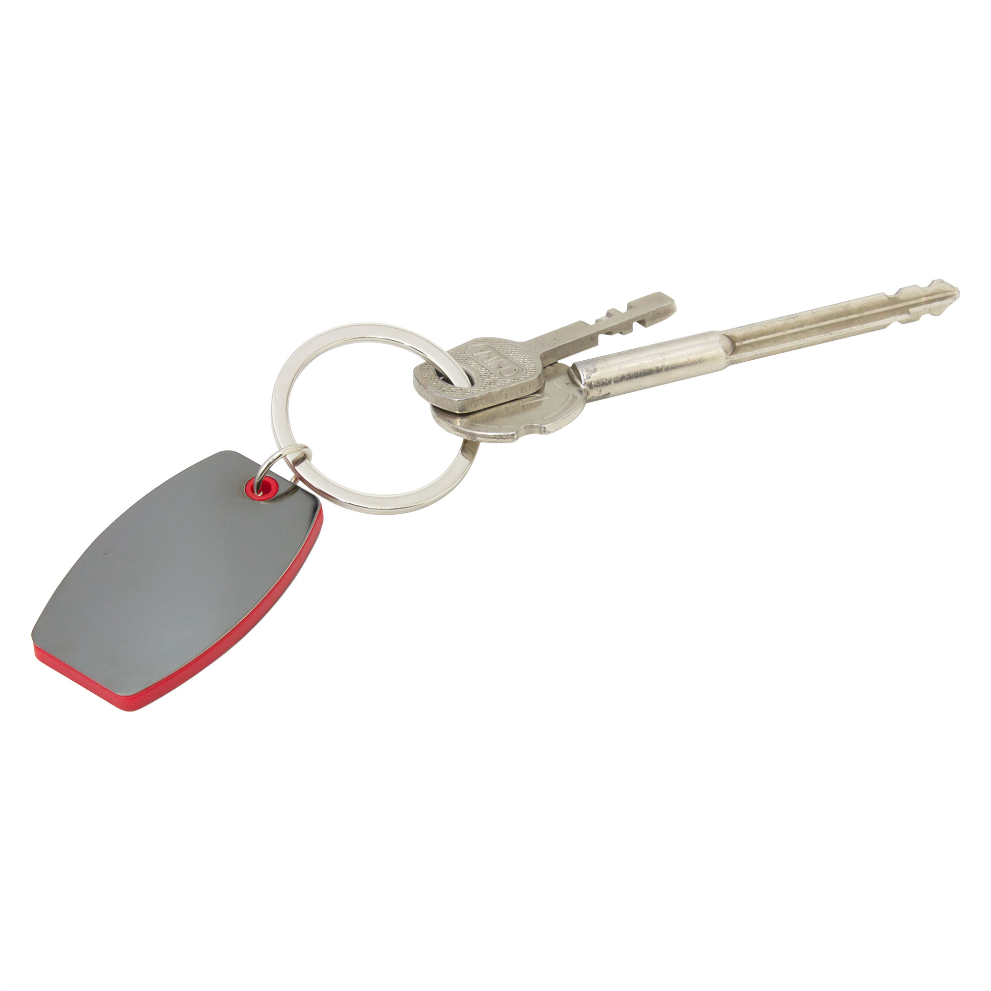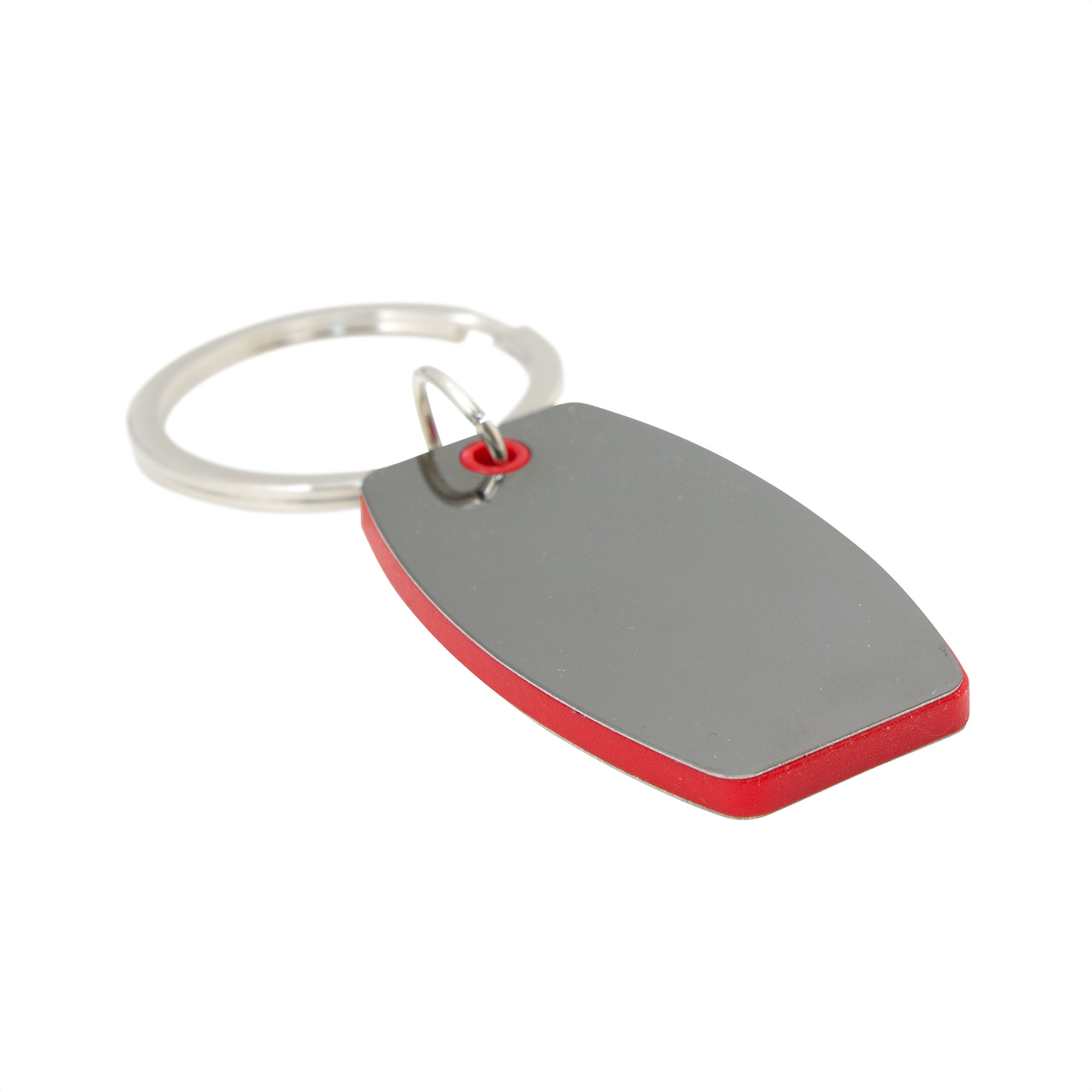 Llavero con forma ovalada. Estructura plástica de color con apliques de acero color gris gun de cada lado. Acabado brillante.