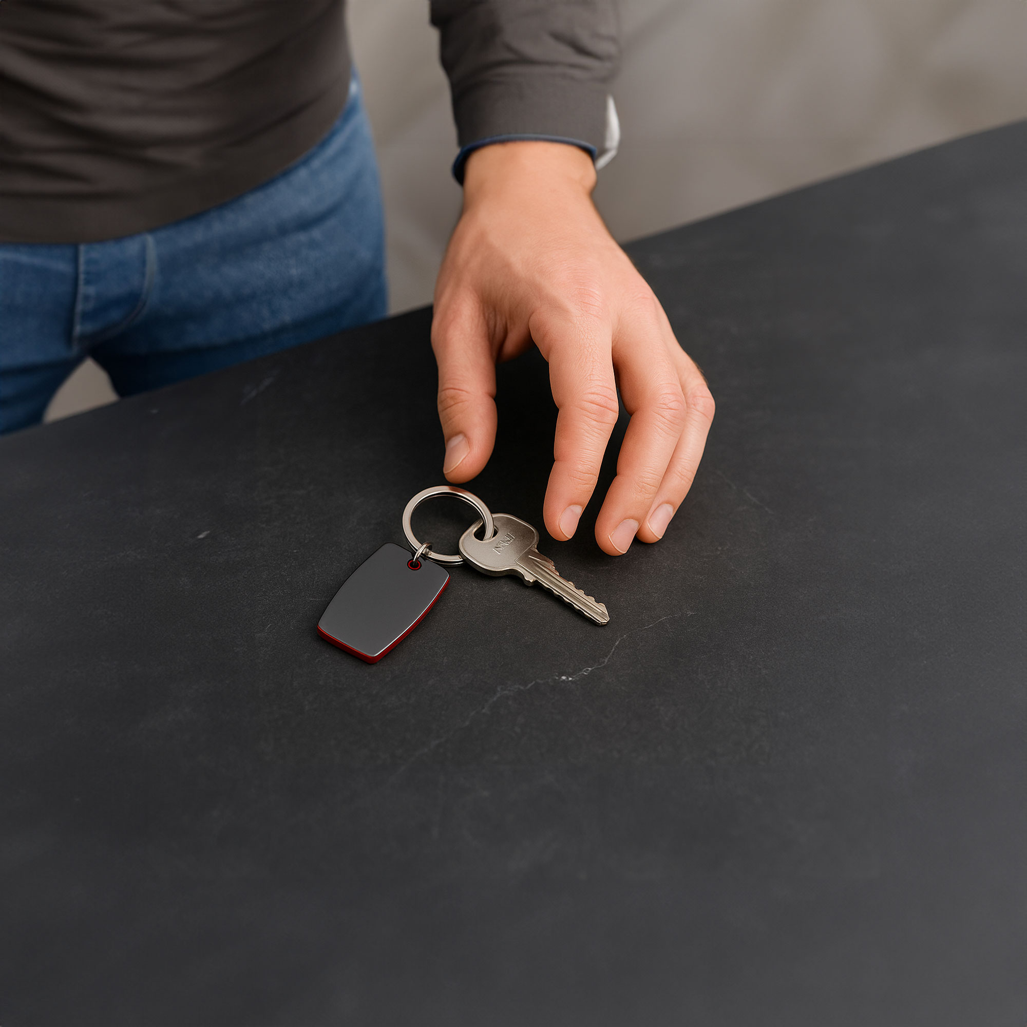 Medidas: 5 x 3 x 0,35 cm. LLavero de Ø 3,5 cm x 0,2 cm.